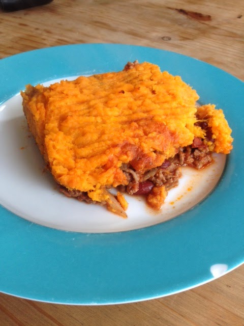 - In a casserole dish at your meat and top with sweet potato.